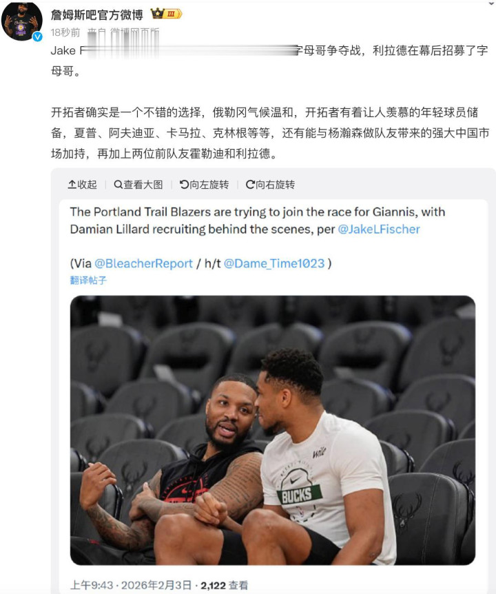 值得一提的是,就在最近NBA的交易窗口期即将结束的时候,外国媒体记者又透露了一个重要的消息。他们表示表哥利拉德目前正在努力幕后招募字母哥,一旦成行的话,后续杨瀚森极有可能和这个NBA巨星成为队友。