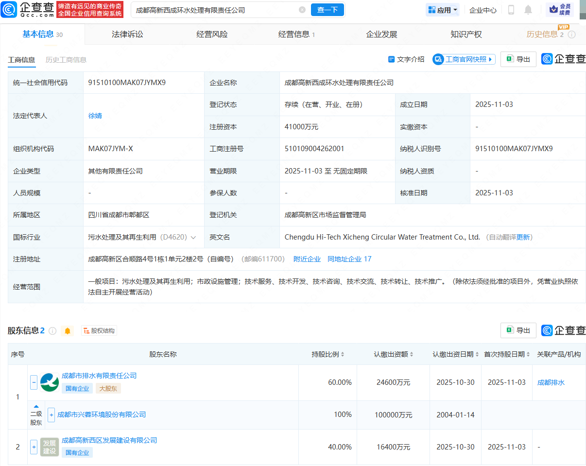 近日嘉正网,成都高新西成环水处理有限责任公司成立,法定代表人为徐婧,注册资本为4.1亿元,经营范围包含:污水处理及其再生利用;市政设施管理等。企查查股权穿透显示,该公司由兴蓉环境(000598)全资子公司成都市排水有限责任公司、成都高新西区发展建设有限公司共同持股。
