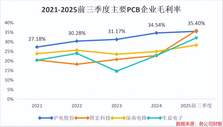 2021到2024年,在主要PCB企业中,沪电股份的毛利率始终保持着领先地位。2025年三季度,沪电股份的毛利率达到35.4%,仅次于胜宏科技的35.85%,在行业中仍然保持较高水平。