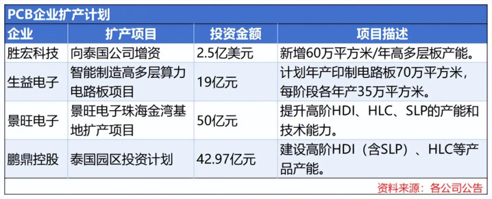 胜宏科技向泰国孙公司增资2.5亿美元建设60万平方米/年高多层板产能,生益电子投资19亿元建设年产印制电路板70万平方米项目,景旺电子、鹏鼎控股等也纷纷宣布扩产计划。
