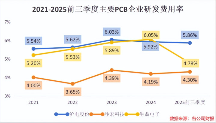 技术的持续突破离不开研发投入的持续增加。2021到2025年前三季度,沪电股份始终保持着6%左右的研发费用率,高于胜宏科技、生益电子等同行。