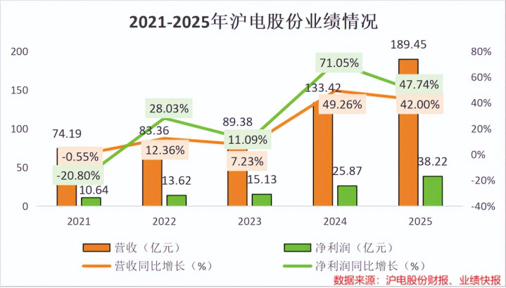 2025年,沪电股份实现营收189.45亿元,同比增长42.00%,净利润38.22亿元,同比增长47.74%。